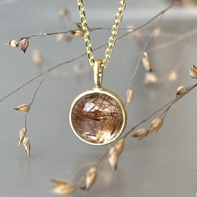 Anhänger "Fynja" umgibt eine geheimnisvolle Ausstrahlung. Der durchsichtige Bergkristall ermöglicht den Blick auf rötlich schimmernde Rutilnadeln, die wie in gefrorenem Wasser zu schweben scheinen.