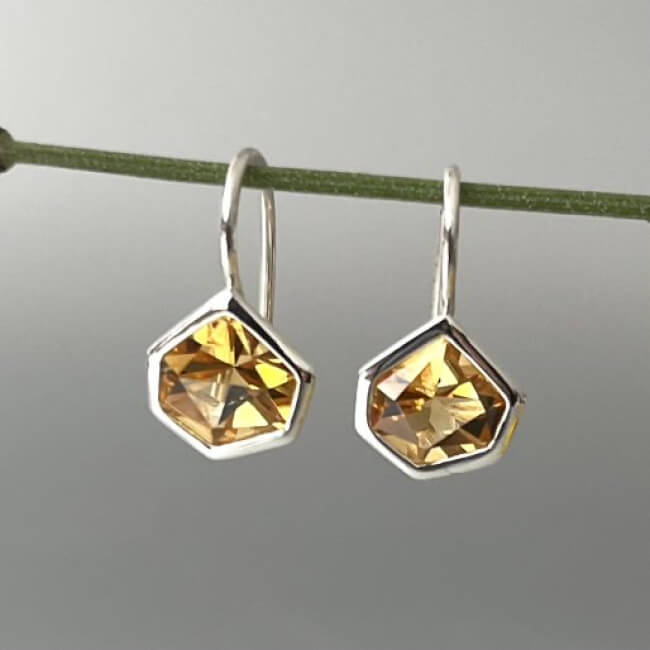 Die Ohrhänger "Lydia", im skandinavischen Design, sind garantiert ein Blickfang. Die geometrisch geschliffenen Citrine erzeugen aus unterschiedlichen Perspektiven immer wieder neue, interessante Ansichten. Das warme gelb der Citrine erinnert uns an die Wärme des Sommers und des Lichts.