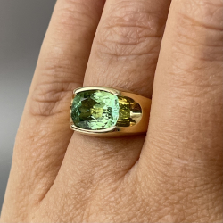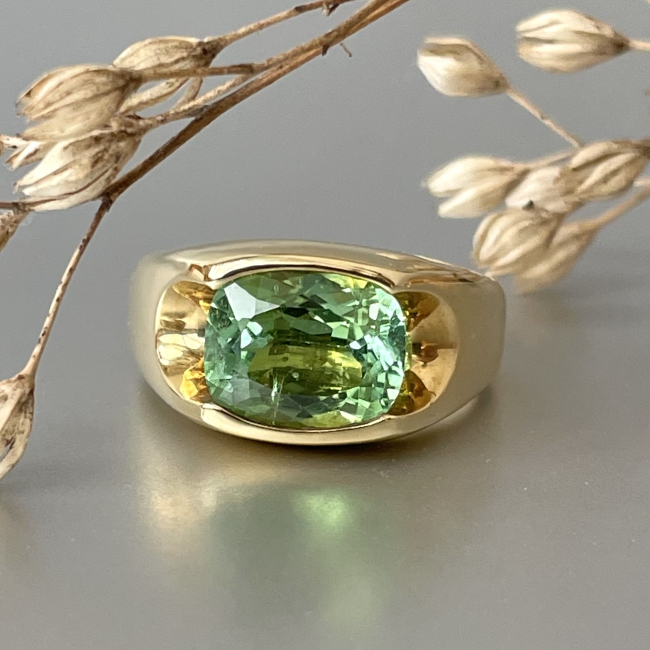 Dieser große grüne Stein, ist in dieser besonderen Farbe, eine echte Seltenheit. Die Art der Fassung lässt Licht in den Turmalin und bietet optisch ein interessantes Spannungsfeld. Für alle Fans von großen Ringen mit großen Edelsteinen ein echtes Muss.